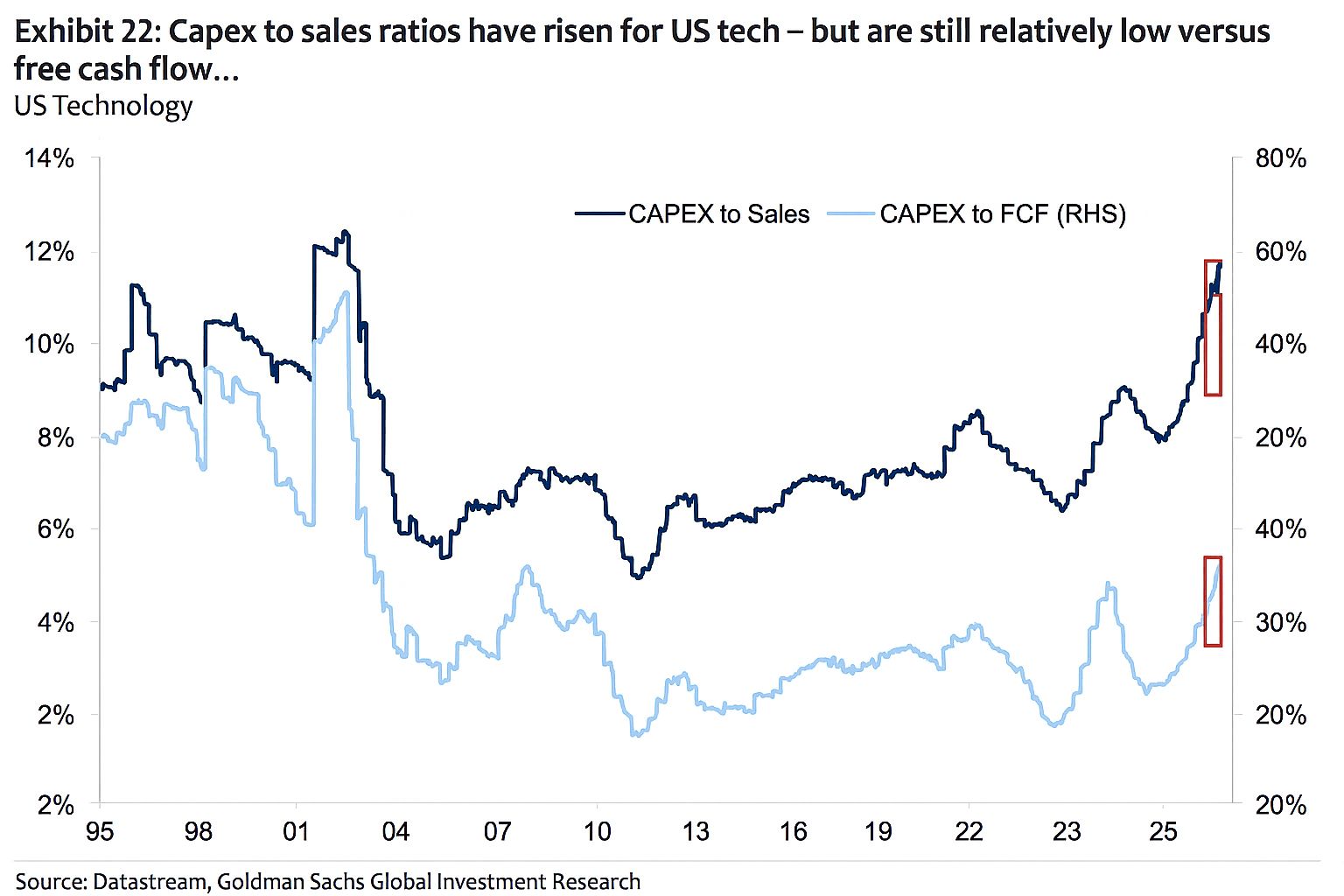 The CapEx-to-Sales ratio just hit 11% — the highest since the dot-com boom in 2000 — and it’s up nearly 4 percentage points since 2022. That’s one of the largest surges on record, and it signals something powerful: the AI infrastructure buildout is still in full swing.