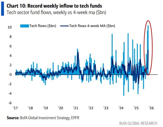 Tech funds just saw a record $10.4 billion in inflows last week — on top of $9.2 billion the week before. That’s the largest two-week inflow in history, with money pouring in at a pace we haven’t seen in years.