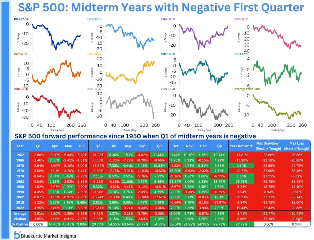 History doesn't repeat perfectly, and 11 instances isn't a massive sample size. Three of those years did recover. But the base rate is clear: the odds are stacked against a strong second half when the first quarter is already negative in a midterm year.
