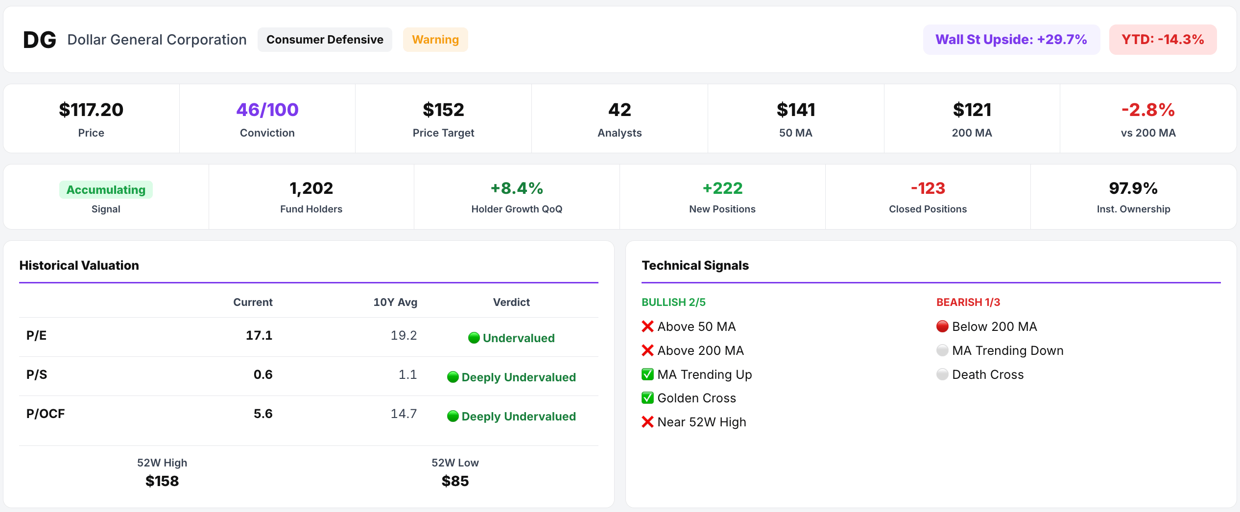 The data on Wall Street Favorites tells the story of where the consumer is headed. Dollar General shows +30% upside to its Wall Street price target of $152 — analysts see value in the discount retailer because that's where consumers trade down when budgets tighten.