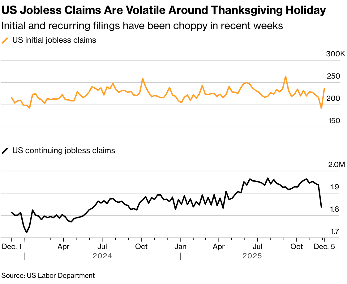Jobless claims spiked +44,000 last week — the biggest jump since early 2020 — but it came right after a Thanksgiving dip that pushed claims to a 3-year low. In other words: this move is more seasonal whiplash than labor-market collapse.