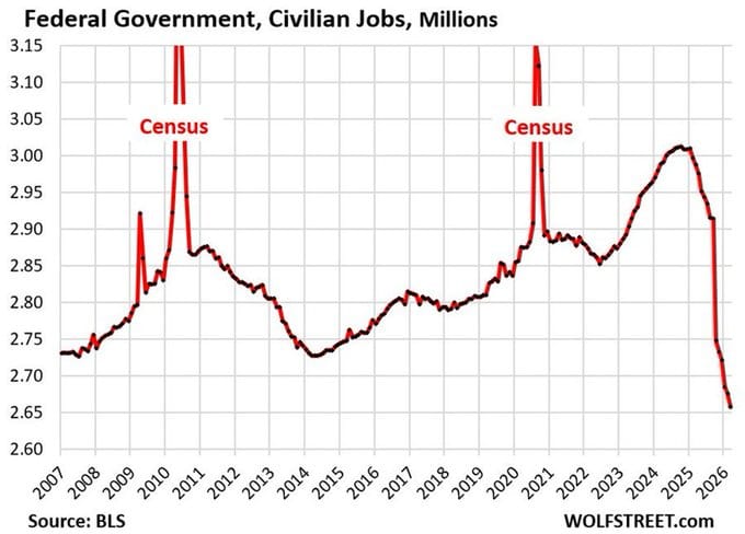 Connect those two dots and you get a very uncomfortable picture: the one employer that used to act as a recession shock absorber is now firing employees at a historic pace, while the private sector isn't creating enough jobs to cover even normal population growth. We're not in recession — but we are in the weakest labor backdrop of the entire post-COVID cycle.