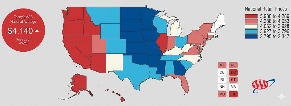 Gas at the pump has jumped from $2.98/gallon to $4.14/gallon in roughly five weeks. That's a +39% spike — the largest we've seen in the last 30 years. It pushes the national average to its highest level since August 2022, directly driven by oil above $100 and the ongoing supply disruption out of the Gulf.