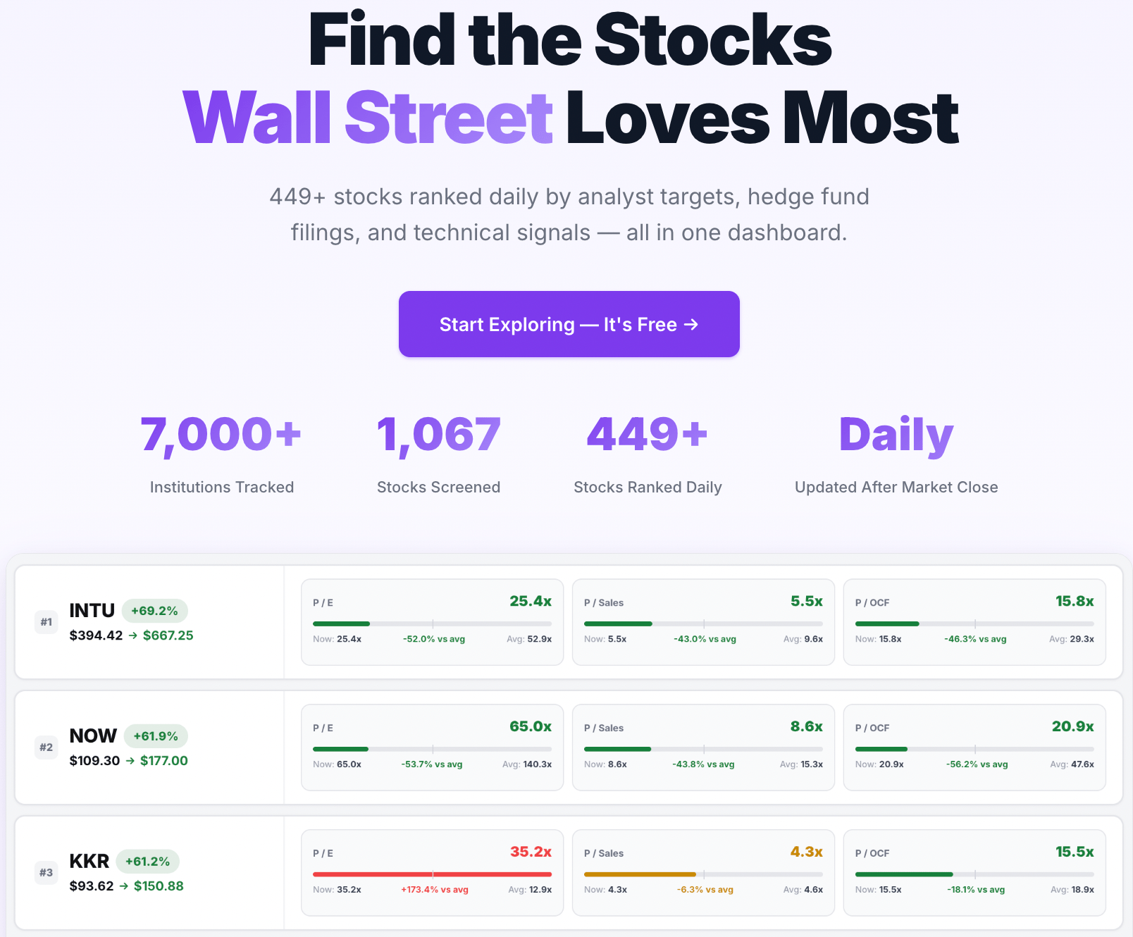 Wall Street Favorites is a stock research platform that ranks hundreds of stocks daily using a blend of analyst price targets, institutional data, and technical signals — all in one dashboard.