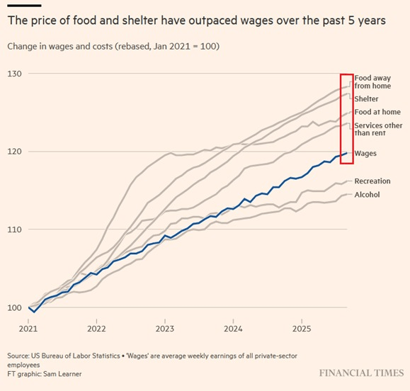 While headline inflation has cooled over the last few years, the real story for consumers is the continued surge in the cost of basic living. The gap between wages and essentials is widening, not narrowing.