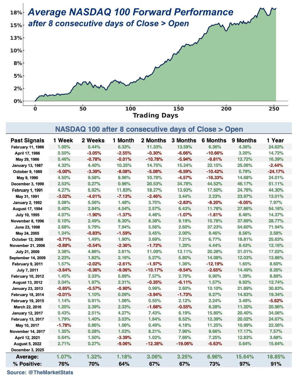 The tech-heavy index just strung together 8 straight trading sessions of closing above its open — a momentum streak investors look for when gauging underlying demand. It doesn’t show up often, but when it does, the forward returns are remarkably consistent.