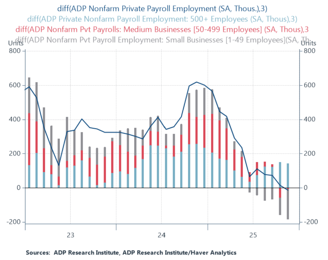 ADP data showed private payrolls fell by -32,000 jobs in November, marking the sharpest one-month decline since 2021. Small businesses cut -178,000 jobs over the last three months, while large firms added +143,000. The divergence between Main Street and corporate America is widening — adding more fuel to the “K-shaped economy” narrative.